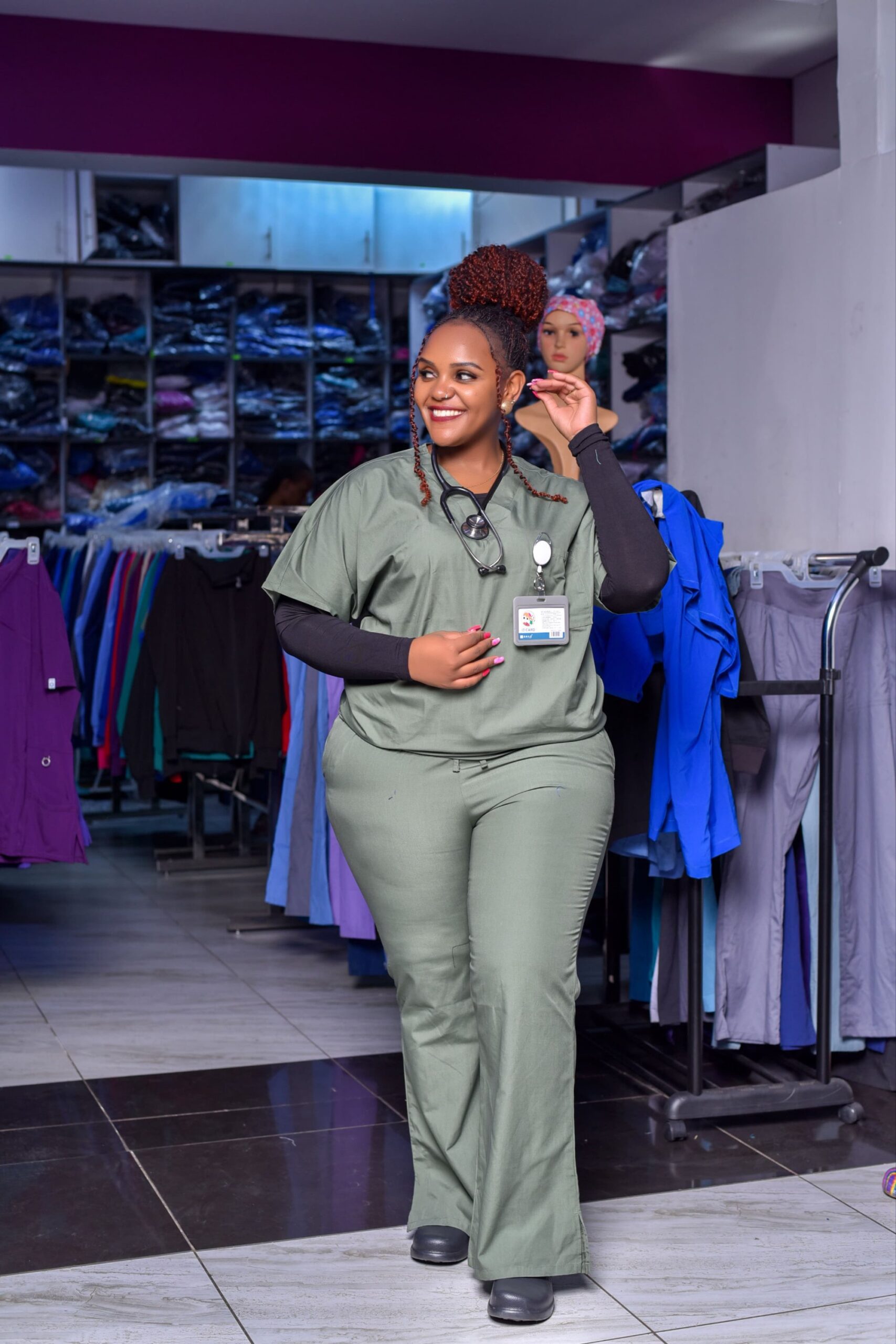 The KMTC ladies’ dress uniform is known for its use of high-quality fabric, which further symbolizes professionalism. Trimmed with the KMTC badge, it creates an atmosphere of elegance and trust. Harmoniously decorated with traditional blue, it shows recognition to the nursing career. Branded uniforms, such as this one that perfectly fit each figure and have all the seams aligned, show their support for health care services based on excellence in patient outcomes.